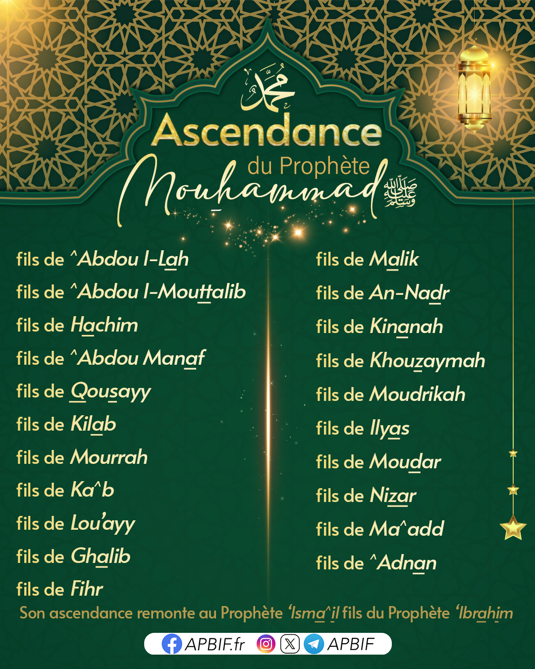 Le Prophète Mouhammad est le dernier des Prophètes Messagers envoyé pour renouveler l’appel à l’Islam. Notre maître Mouhammad était le fils de ^Abdou l-Lah, lui même fils de ^Abdou l-Mouttalib fils de Hachim fils de ^Abdou Manaf fils de Qousayy fils de Kilab fils de Mourrah fils de Ka^b fils de Lou’ayy fils de Ghalib, fils de Fihr fils de Malik fils de An-Nadr fils de Kinanah fils de Khouzaymah fils de Moudrikah, fils de Ilyas fils de Moudar fils de Nizar fils de Ma^add fils de ^Adnan.